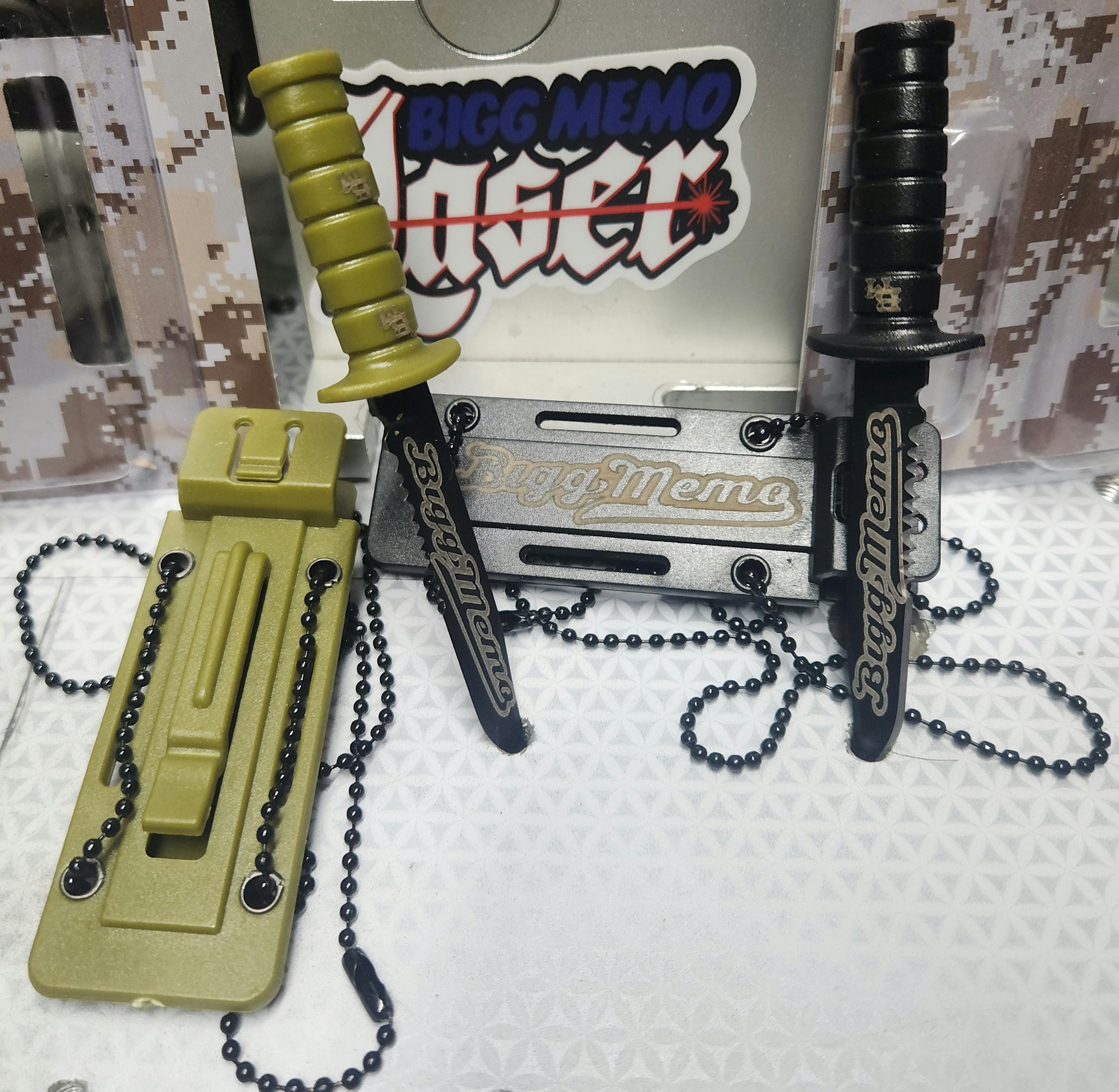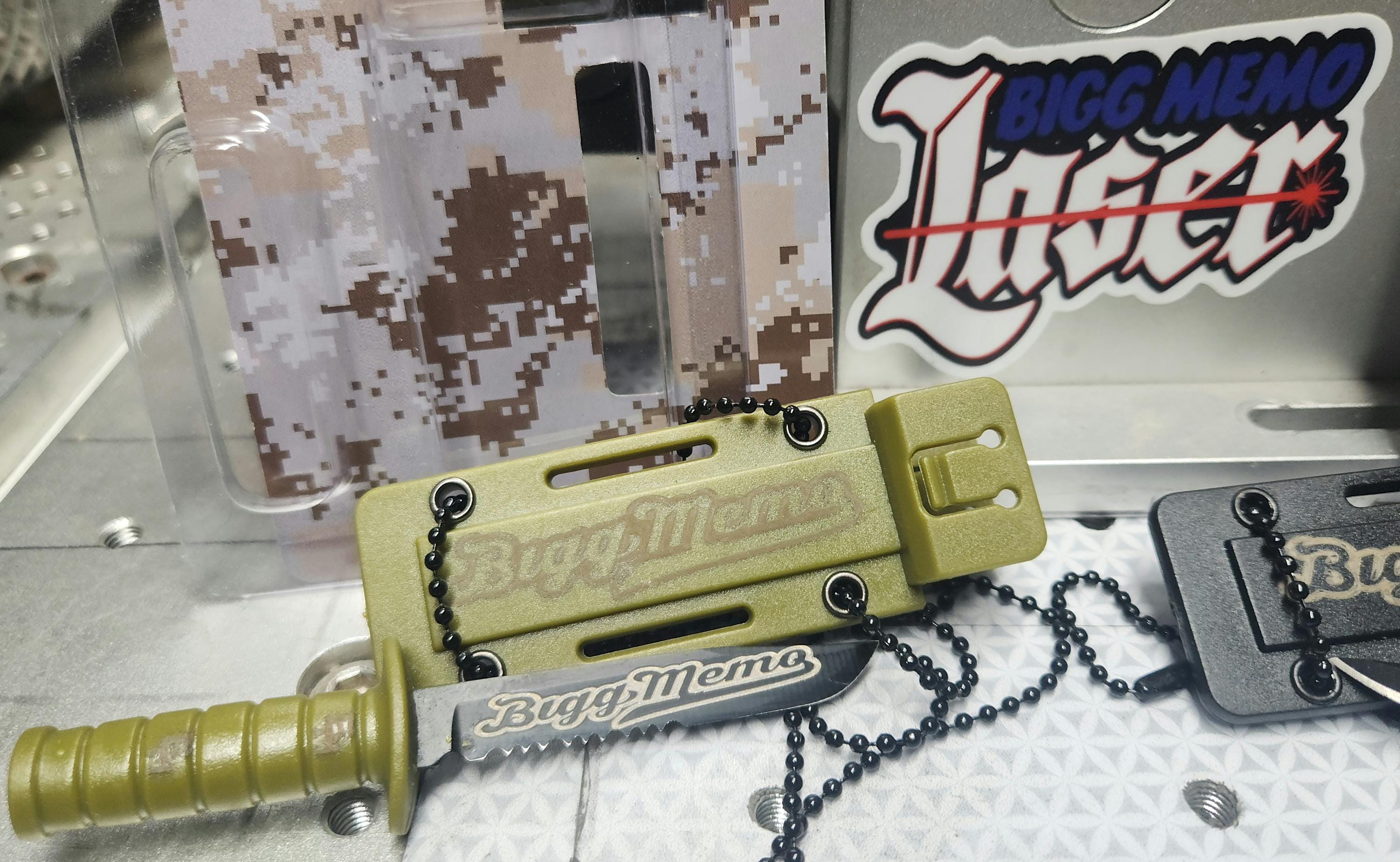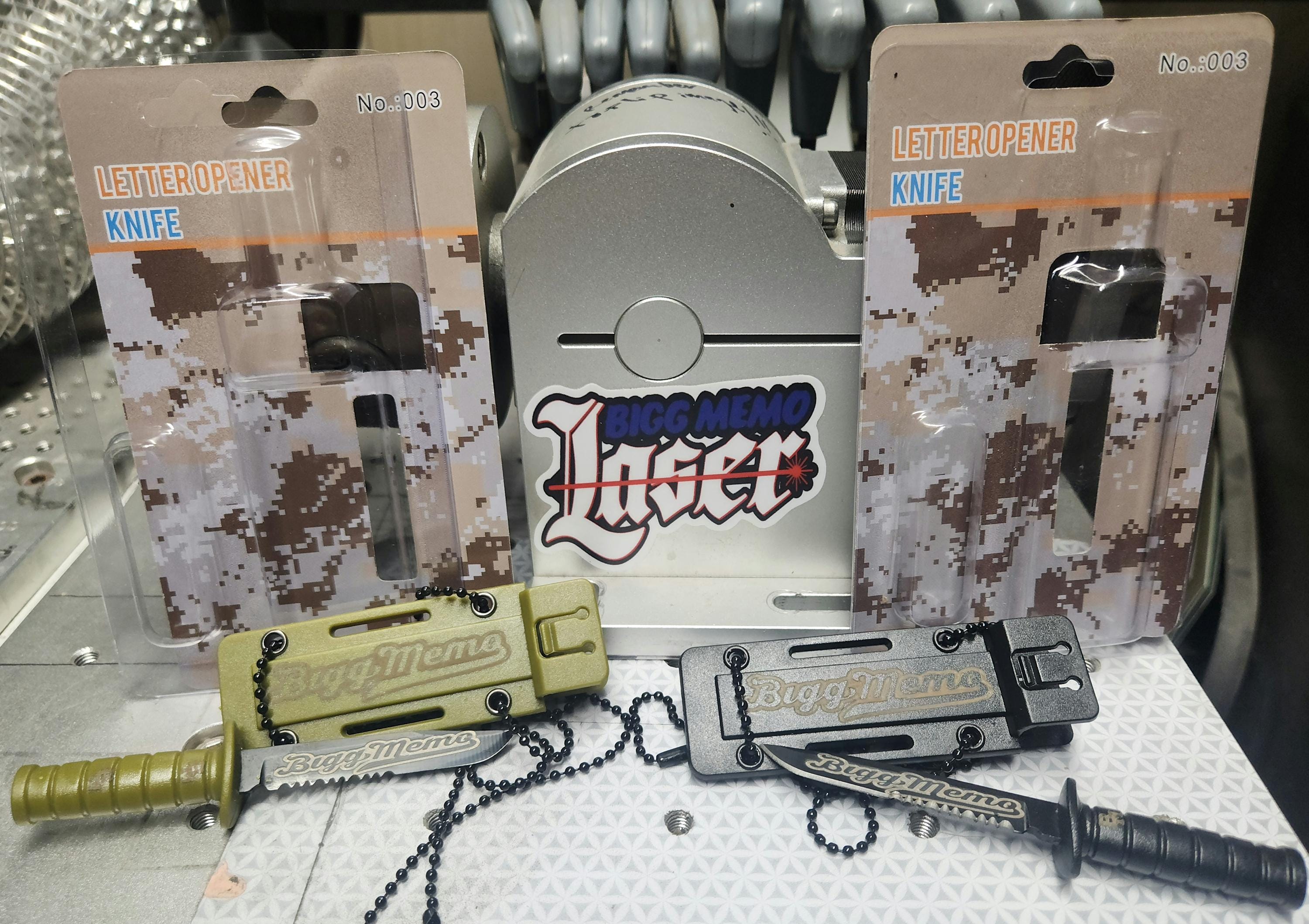 Letter opener in the shape of a fighting knife with or without laser engraving on the blade. Engraving available on reverse side of blade and sheath. Polymer sheath included. Measures 4″ overall, with 2 1/2″ blade