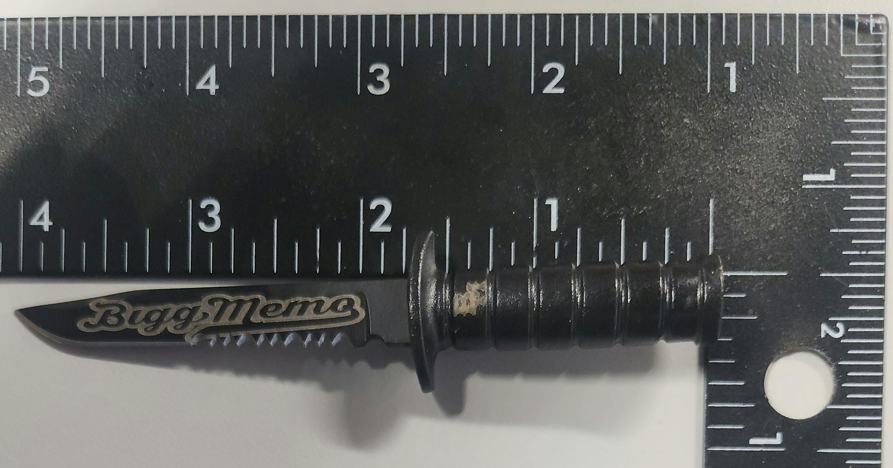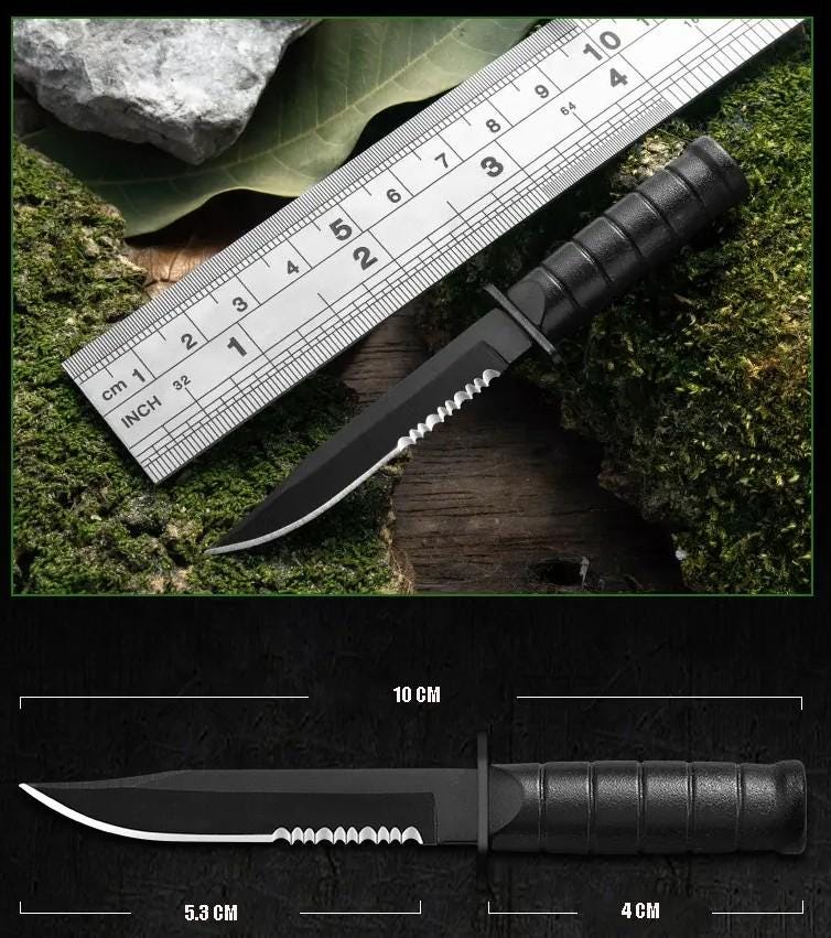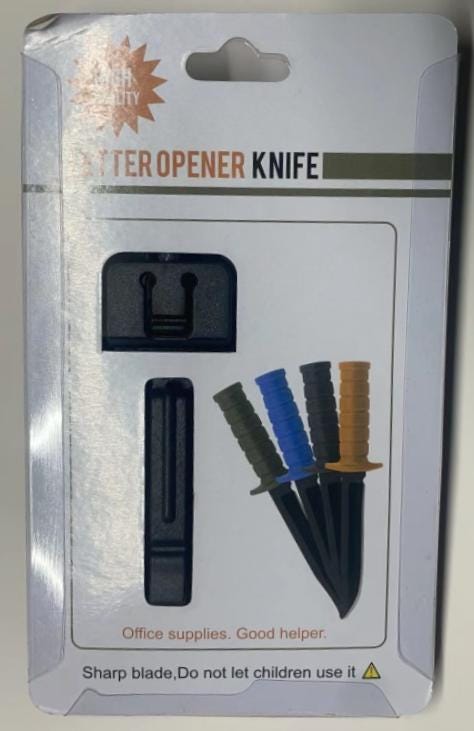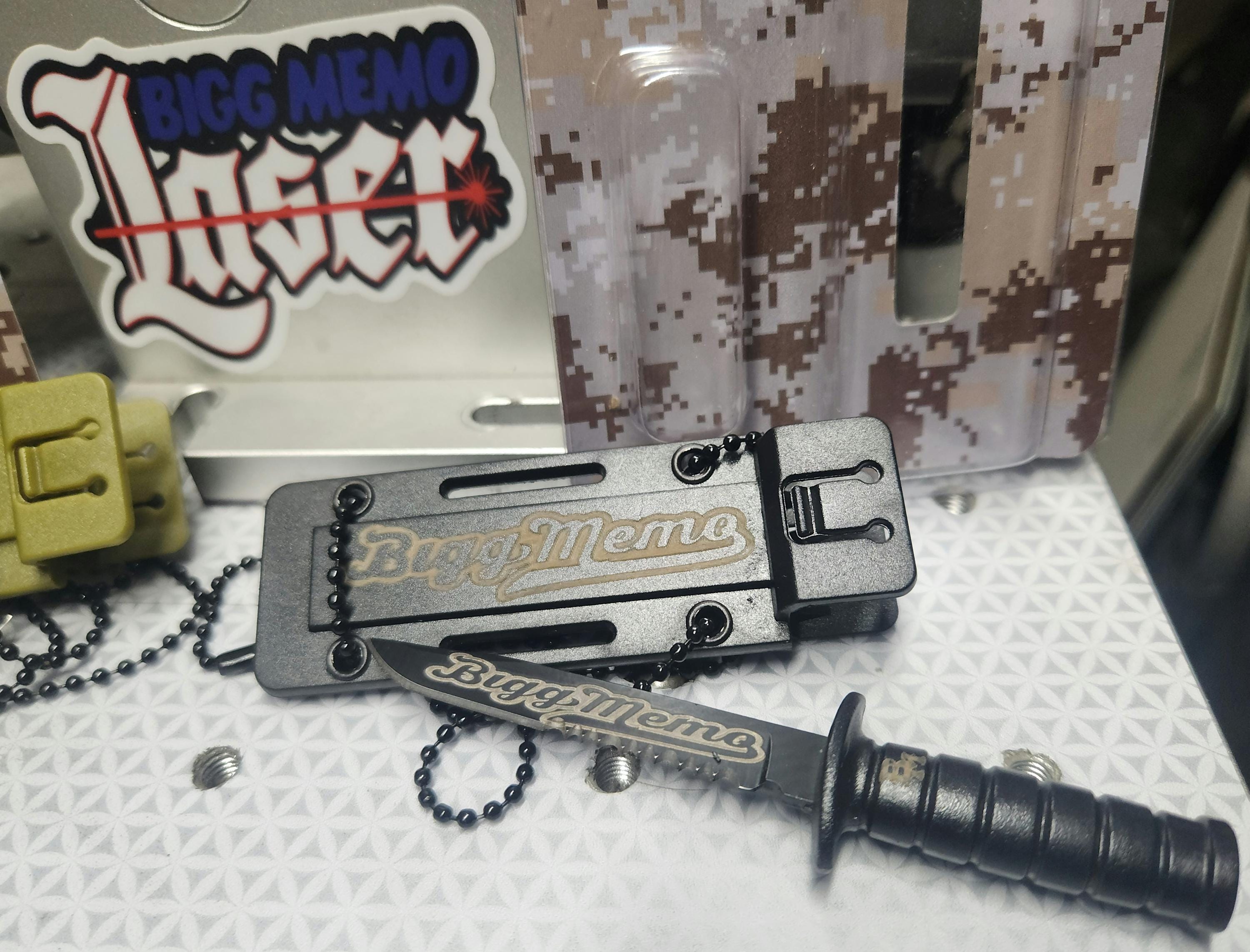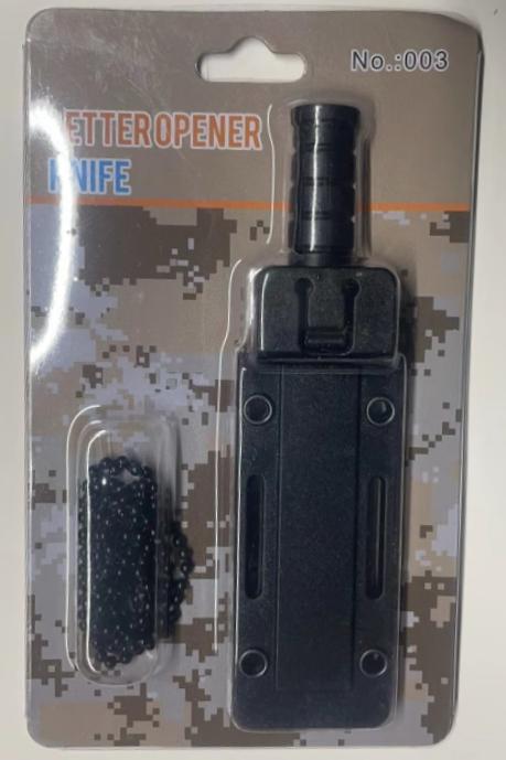 Letter opener in the shape of a fighting knife with or without laser engraving on the blade. Engraving available on reverse side of blade and sheath. Polymer sheath included. Measures 4″ overall, with 2 1/2″ blade